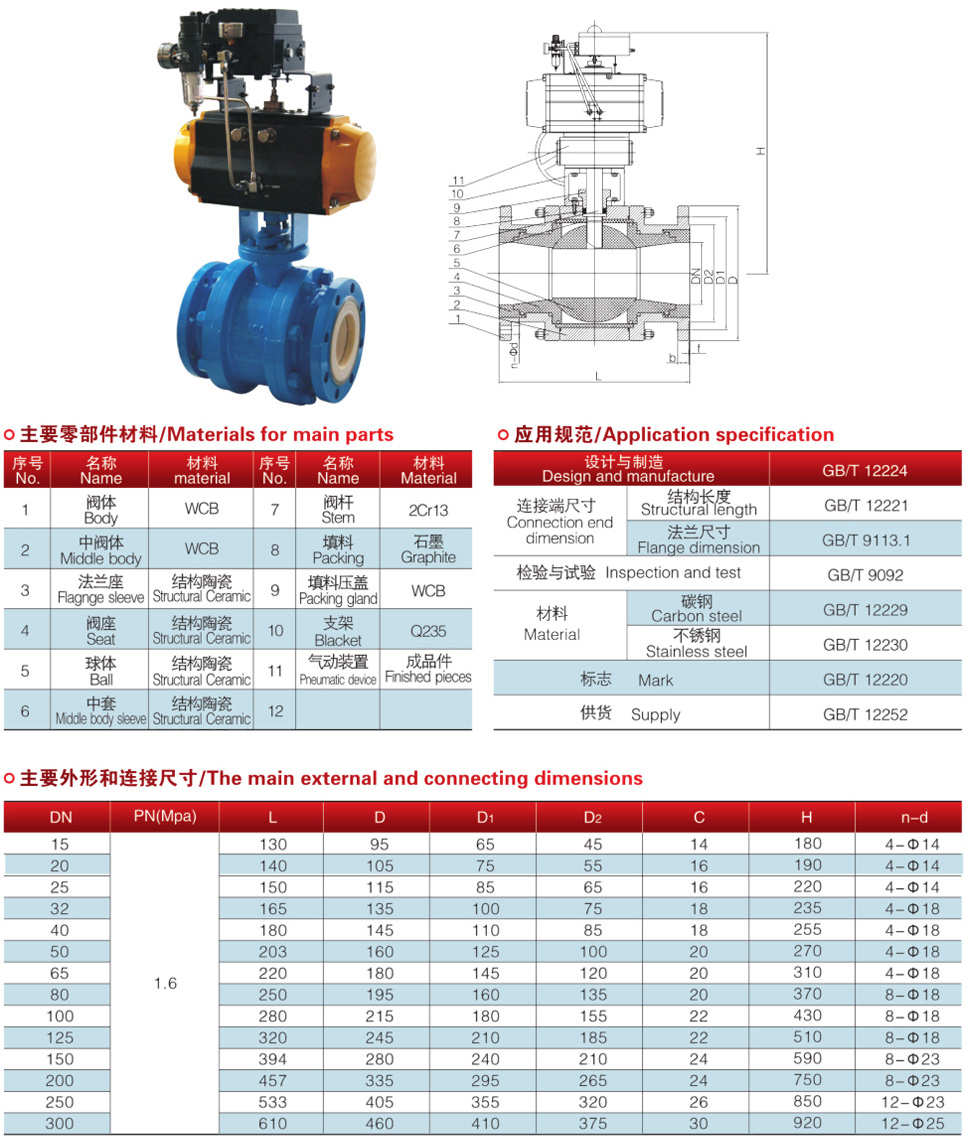 球体采用研磨设备及工艺制造,球圆度精度高、表面质量好、与阀座对研后,利用结构陶瓷的自滑润性,具有很好的密封性能。彻底改变了金属硬密封球阀易泄露、扭矩大、密封面不耐腐蚀的缺点。阀座、球体具有良好的耐磨性、使用寿命长,是钛合金阀和蒙乃尔阀的2-4倍。本阀为三片式结构,可按照GB、JIS、 API等 标准数据制造。