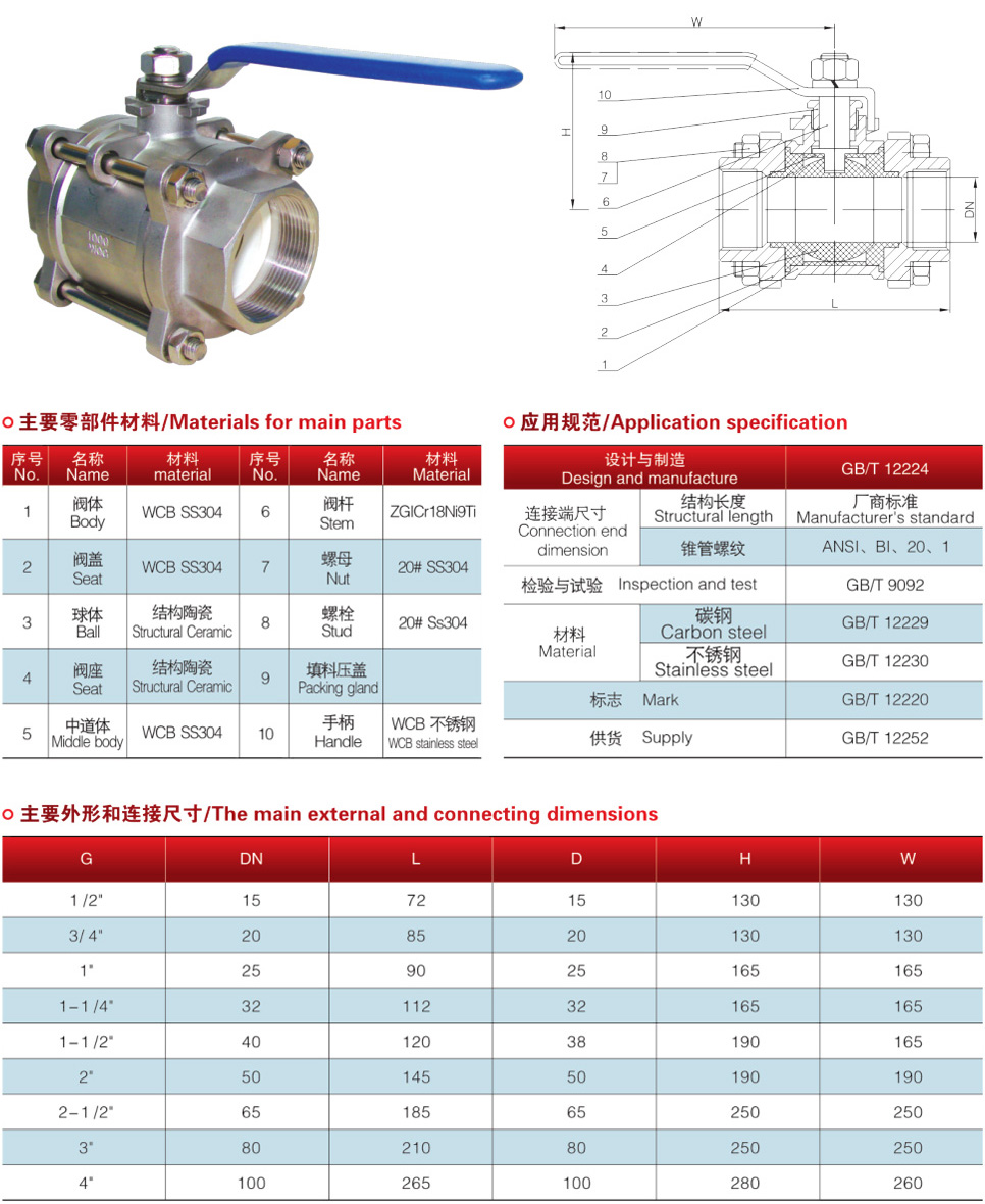 3Pc陶瓷球阀内改装陶瓷阀心,改善普通阀门因软密封结构,阀门容易被磨损及扭矩重的缺点。陶瓷阀扭拒轻,如需要安装执行器可安装小型号的。从中节省成本。更重要是阀门经贸耐用,减少管道很多不必要的维护及费用。更是品质环保的见证。外形小巧,经济实用。