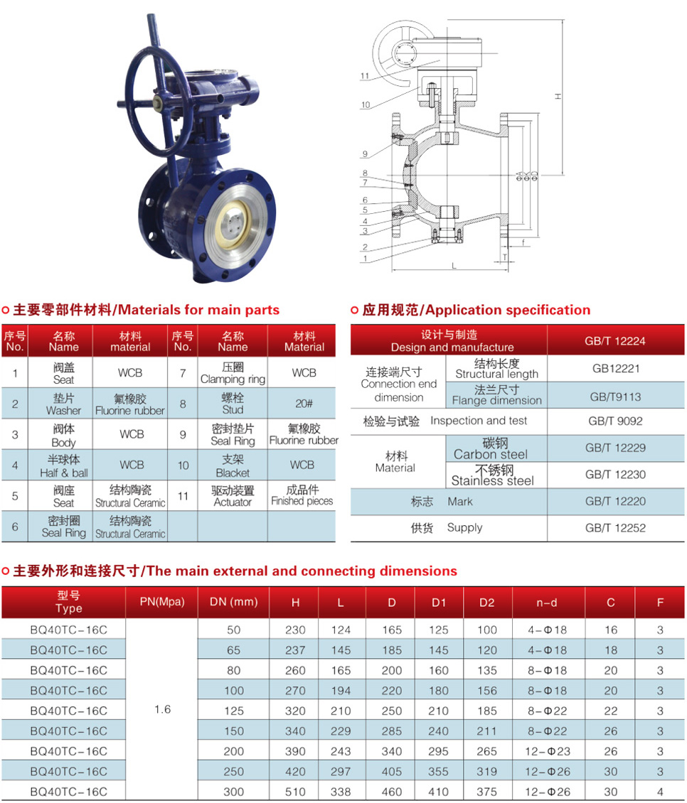 阀门的阀座和半球体的密封面均采用工程陶瓷、硬度高、耐冲蚀、寿命长。适用于含有粉状颗粒的固液混合介质,作启闭用;半球体为固定球式,刚性好。形状为V形半球,体积小,重量轻;阀座密封面与半球密封面间距具有可调性,故阀门在使用一定时间后,密封面间距可再进行调整,延长阀门寿命;阀门在全开时,阀体通道完全畅通,介质流阻小。