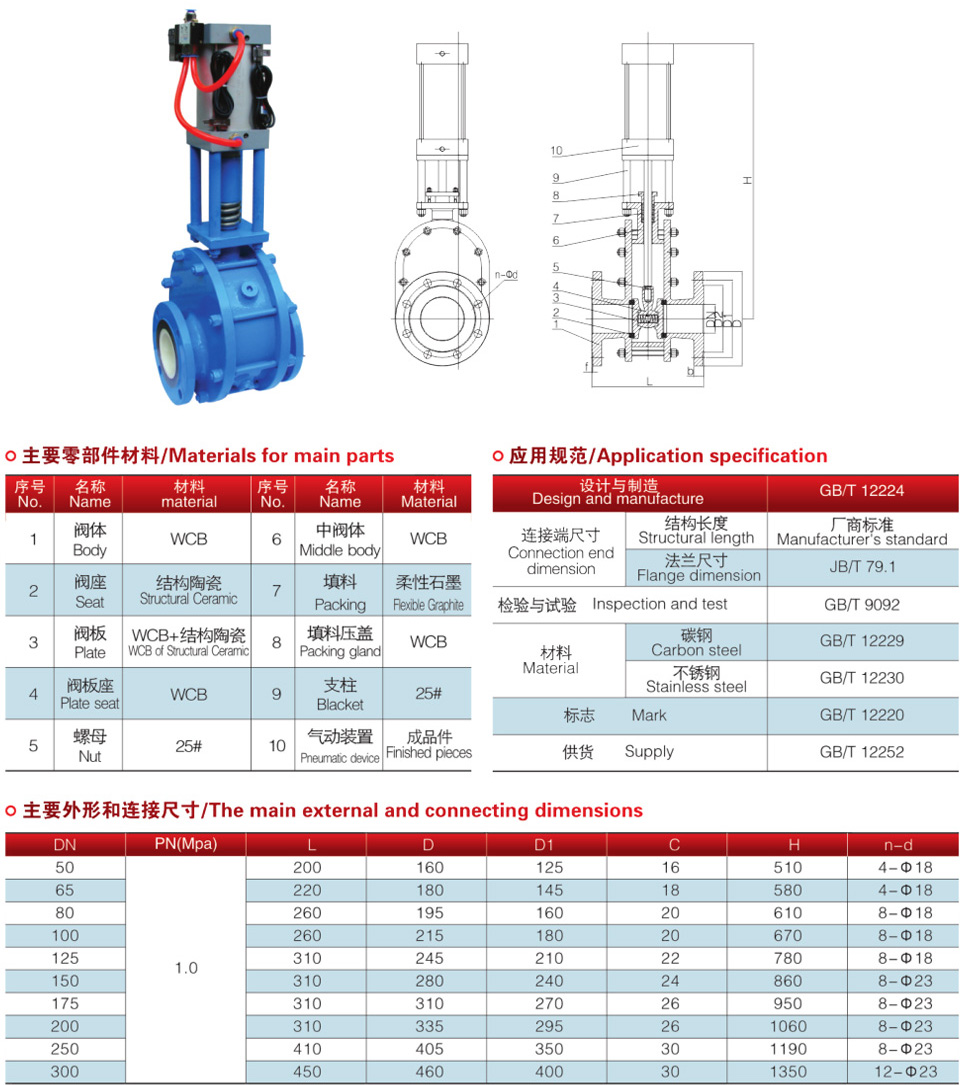 气动陶瓷双闸板阀采用结构陶瓷做密封件,耐冲刷、耐磨性好。撑开式双闸板密封结构,阀门关闭时双向密封;根据不同工况可设置吹扫口、灰渣漏斗,适用于干灰系统、渣浆等介质的输送系统中;积灰少,无卡涩,维护简单,使用寿命长。气动执行器采用全封闭推杆式直缸驱动,性能可靠,输出扭距大,可满足在恶劣工况条件下工作。也可适用于矿山、造纸、化工等各类有磨损的干粉尘、水蒸汽等介质。