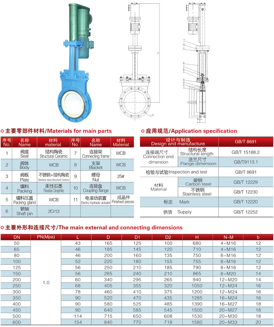 闸板、阀座密封面材料采用结构陶瓷制造,耐磨损、耐腐蚀、抗高温、密封面采用硬密封与介质接触的部分均为结构陶瓷材料,其化学稳定性及硬度极高。因此,本阀具有极高的耐磨损、耐腐蚀、耐冲蚀性能,且隔热性好、热膨胀小。