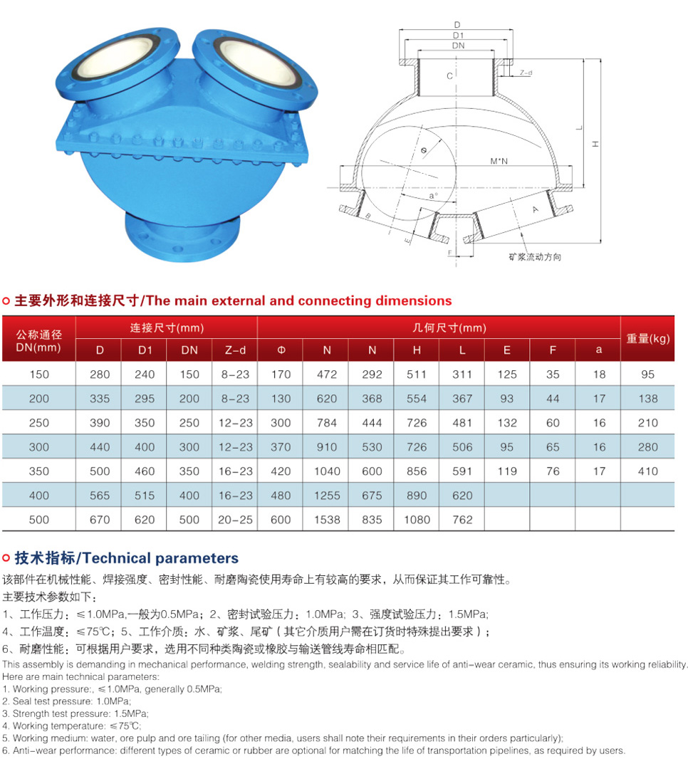 矿浆换向止回阀(浆液自动切换阀,三通阀,泰乐阀),有两个进口,一个出口,当浆液从一个进口进入时,另一个进口会自动封闭。一般工业生产采用的浆体泵都是使用一台,备用一台。当开启-台泵和阀门时,就要关闭另一台泵和阀门,容易造成备用泵阀门至管道汇集口处的堵塞,以后开启时非常麻烦。利用自动切换阀可完全避免这种情况,当一个进口备用泵时非常顺畅,操作方便,灵活。阀体内衬采用结构陶瓷或高耐磨橡胶,抗磨损性能强,经久耐用,使用寿命长。适用于浆体输送泵一用一备各种化工厂,石油,发电,矿山,给排水等场合。