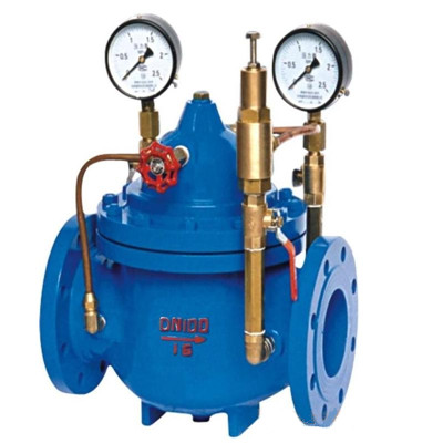 当阀门从进口端给水时,水流过针阀进入主阀控制室,出口压力通过导管作用到导阀上。当出口压力高于导阀弹簧设定值时,导阀关闭。控制室停止排水,此时主阀控制室内压力升高并关闭主阀,出口压力不再升高。当阀门出口压力降到导阀弹簧设定压力时,导阀开启,控制室向下游排水。由于导阀系统排水量大于针阀的进水量,主阀控制室压力下降。进口压力使主阀开启。在稳定状态下,控制室进水、排水相同,主阀开度不变,出口压力稳定。调节导阀弹簧即可设定出口压力。